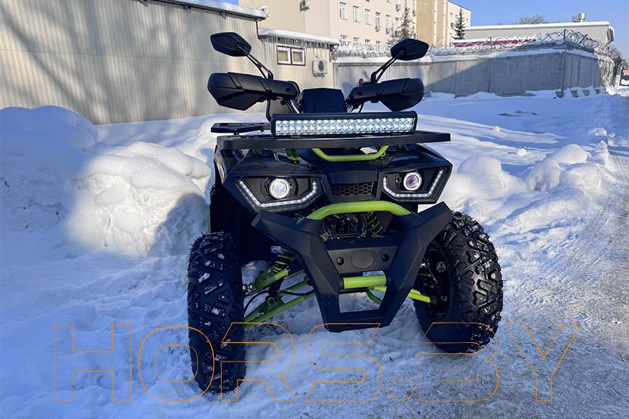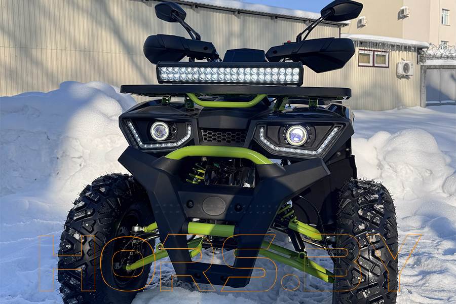 Купить квадроцикл хорс 035 подталкивает и подвеска: независимая передняя — четырехрычажковая с гидравлическими амортизаторами, задняя зависимая подвеска маятникового типа также представлена гидравлическим амортизатором для улучшения качества вождения. Такая подвеска обеспечит плавность хода при передвижении по бездорожью. Передняя часть квадроцикла защищена мощным бампером, который защищает от механических повреждений. Плюсом стало и наличие в новой модели фаркопа, который позволит присоединить небольшой прицеп для перевозки вещей.