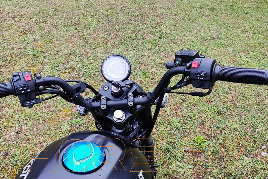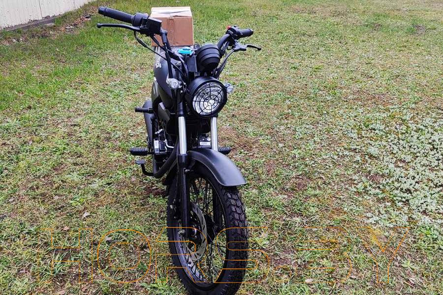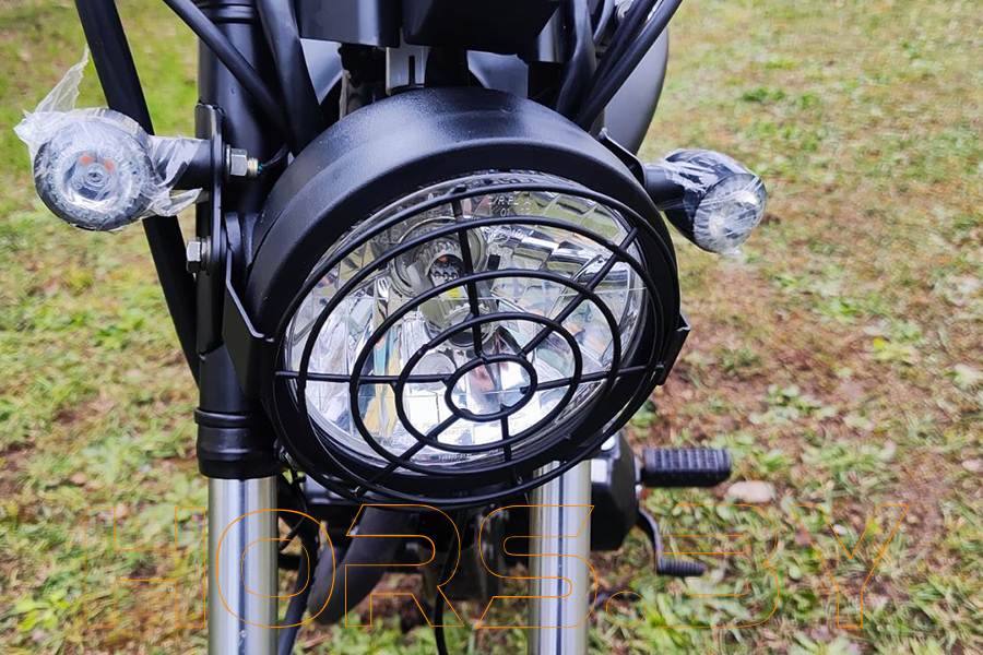 Фара головного света имеет классическую круглую форму, а также специальную металлическую решетку “паутинку”, которая была так популярна раньше на мотоциклах класса типа скремблер.