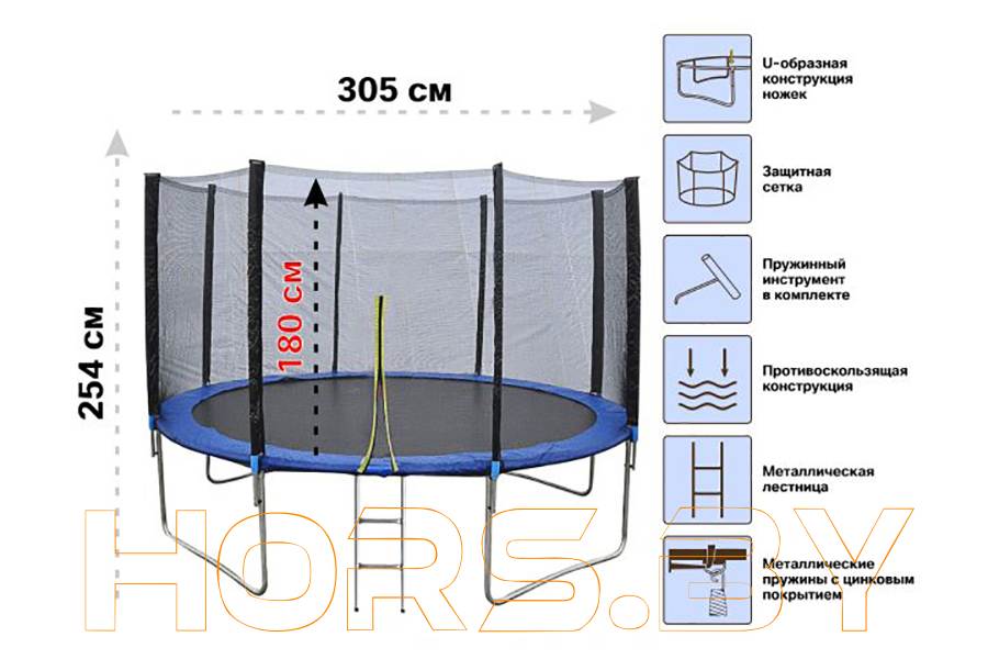 Батут с защитной сеткой и лестницей, 305х74 см, ARIZONE - характеристики